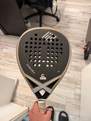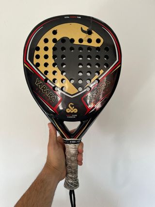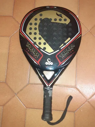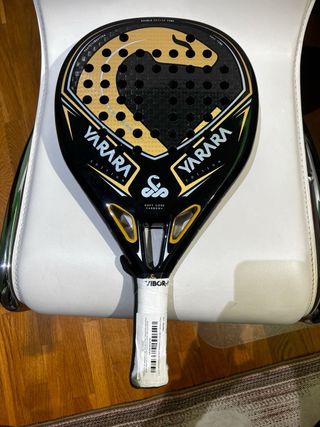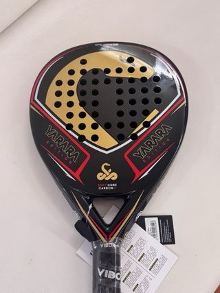 Pala de pádel Vibora Yarara, edición especial. - Diseño con detalles en dorado y negro. - Logo de Vibora. - Incluye correa de seguridad. - SOLO SE HA JUGADO 1 VEZ CON ELLA, SIN RALLAJOS, NI MARCAS DE HABERSE USADO