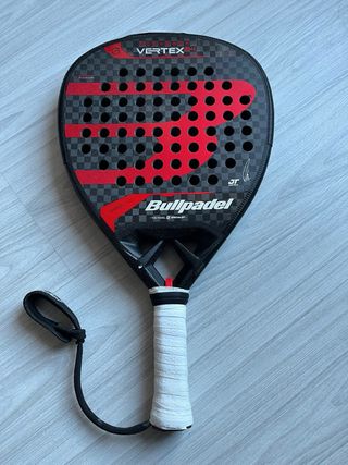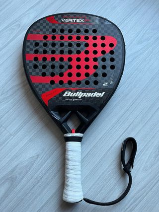 Pala de pádel Bullpadel Vertex 04. - Peso: 377 gramos con uno over sobre el de casa, protector y cuerda - Diseño con acabado en carbono y detalles en rojo. - Sin Hexacore - 4 meses de uso, caras en perfecto estado, con el rugoso en perfecto estado - Roces superficiales en los cantos sin afectar al carbono, siempre con protector Babolat nox adidas víbora head kombat