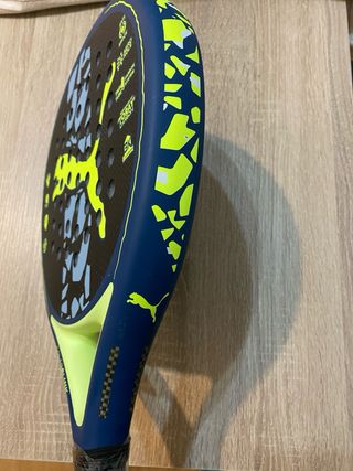 Pala de pádel Puma Solarblink. Precintada - Marco azul oscuro con detalles en verde lima. - Superficie negra con el logo de Puma en verde lima y diseño abstracto azul. - Control sin renunciar a la potencia. Dureza media. 365g #adidaspadel, kuikma, vibora, akkeron, nox, bullpadel, siux, babolat,