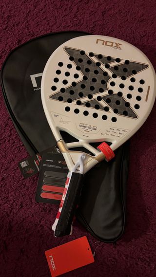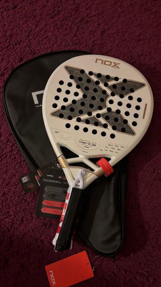 Pala de pádel NOX AT10 12k Xtreme. - Nueva a estrenar con pesos y overgrip incluidos - Pala de pádel con acabado en blanco y detalles dorados. - Diseño con la icónica 'X' de NOX en negro. - Incluye funda protectora negra. NO NEGOCIABLE Adidas, ale, galán, Head, Arturo Coello, Babolat, Lebron, Siux, Lok, Set, Vibora, Starvie, Bullpadel, Vertex, Hack