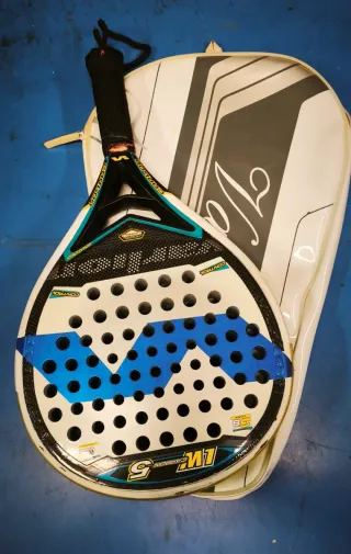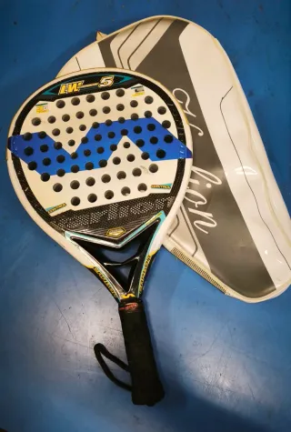 Pala de pádel Varlion LW 5 con funda. - Diseño con agujeros. - Detalles en azul y negro. - Empuñadura negra. Algunos roces pero funcional perfectamente.