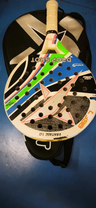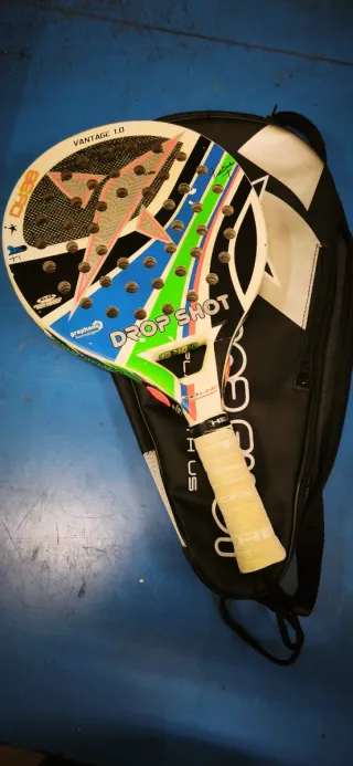 Pala de pádel Drop Shot Vantage 1.0 con funda. - Pala con diseño moderno y llamativo. - Incluye funda protectora. - Pala con roces pero funcional. Bien cuidada