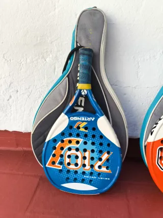 Se venden dos palas de pádel, una de color naranja con el número 700 y la marca Artengo, y otra de color rojo con un diseño llamativo. - Pala naranja con detalles blancos. - Pala roja con diseño multicolor.