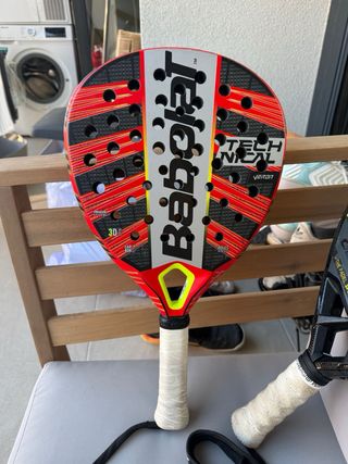 Pala de pádel Babolat Technical Veron con diseño llamativo en rojo y negro. - Marco con acabado en carbono. - Agarre blanco. - Incluye cordón de seguridad negro. La pala esta reparada,va muy bien, se puede probar sin compromiso