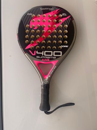 Pala de pádel Slazenger V400 Supreme Alevín con diseño llamativo en negro y rosa. - Pala de pádel para jugadores alevines. - Diseño V400 Supreme. - Acabado en negro y detalles en rosa. - Incluye cordón de seguridad. Incluye funda Babolar