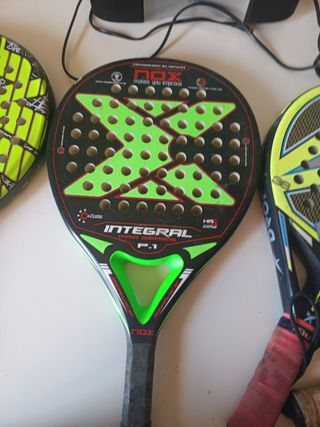 Vendo 5 palas de pádel en buen estado. - Una pala Nox Integral Pro Series P1, de color negro y verde lima. - Una pala Drop Shot D20 Shot, en color negro y amarillo. - Ambas palas presentan un diseño llamativo.
