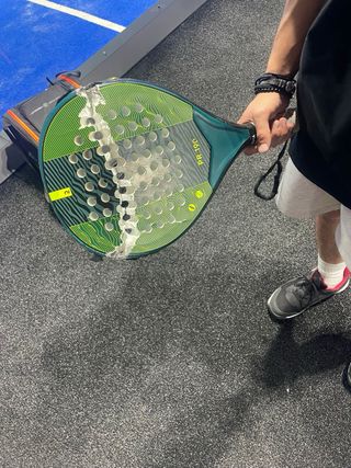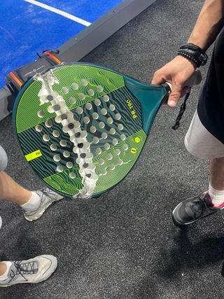 Pala de pádel Kombat Ulises No tiene ninguna rotura en las caras, solo roces superficiales en el canto de la pala. Le quité el protector y se quedó un poco del pegamento, de ahí que se vea así. Pala con un peso de 363 gr bastante ligera y tacto blanco para evitar dolor en el codo, muy manejable en fondo de pista.