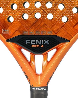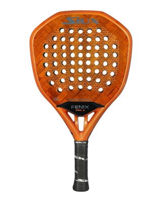 Pala de pádel Siux Fénix Pro 4 con un diseño llamativo. - Acabado en color naranja y detalles en madera. - Forma redonda. - Superficie con agujeros.