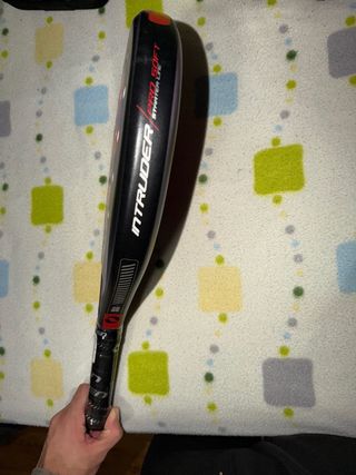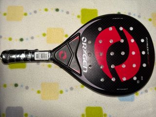 Pala de pádel OXYGEN INTRUDER, en perfecto estado ya que no ha sido utilizada. - Diseño en negro con detalles en rojo. - Logo de la marca OXYGEN en el centro. - Agarre envuelto en plástico protector.