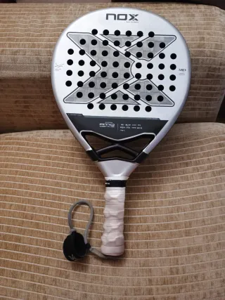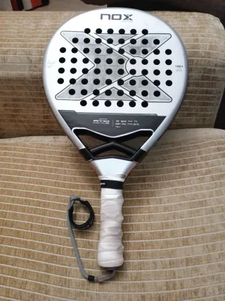 Pala de pádel Nox AT10 Genius 18K, modelo de Agustín Tapia. Diseñada con un acabado plateado y detalles en negro. - Superficie con acabado 18K. - Diseño con la icónica 'X' en el centro. - Incluye cordón de seguridad. - Logo de NOX en la parte superior. Regalo funda!