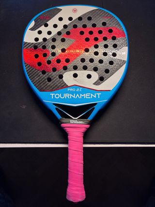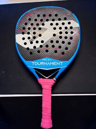 Pala de pádel Joma Tournament Pro 2.0 con un diseño llamativo en azul, rojo y gris. - Superficie con acabado en carbono y detalles en rojo. REPARADA DE AHÍ EL PRECIO