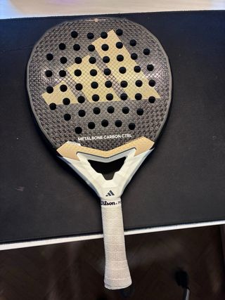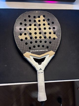 Pala de pádel Adidas Metalbone Carbon Ctrl. No tiene ninguna rotura en las caras, roces o saltos de pintura superficiales en el canto de la pala Pala con un tacto tirando a duro, con un peso bastante manejable de 357-358 gr.