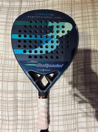Pala de pádel Bullpadel Vertex - Diseño en tonos azules y verdes. - Superficie con agujeros. - Grip blanco. - Pequeño roces que no afectan a la pala.