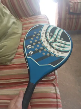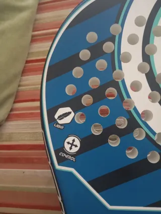 Pala de pádel con un diseño moderno en tonos azules y grises. Está en perfecto estado, casi sin uso. - Diseño con rayas azules y detalles blancos. - Agujeros redondos en la superficie. - Mango negro para un buen agarre.