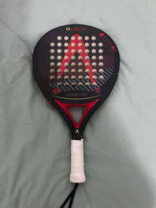 Pala de pádel con diseño Boomerang y acabado Block. - Color negro con detalles en rojo. - Agarre blanco. - Cordón de seguridad negro.