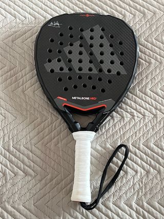 Pala de pádel Adidas Metalbone HRD. - Pala de pádel de alta gama. - Diseño en negro y blanco con detalles en rojo. - Logo de Adidas en la cara. - Grip rojo para un mejor agarre.