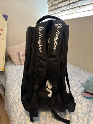 Bolsa de pádel de la marca Jhayber. - Color negro. - Diseño con logo. - Asa superior y correa para colgar. - perfecto para guardar ropa, zapatillas y espacio especial para palas.