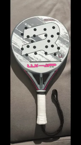 Pala de pádel Royal Padel Whip 25 con poco uso, planos perfectos solo saltos de pintura de quitarle el protector que no influyen a la pala con un diseño moderno y llamativo. - Pala de pádel. - Modelo Whip 25. - Marca Royal Padel. - Color gris, blanco y detalles en rosa. - Incluye cordón de seguridad negro.