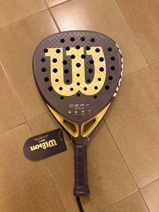 Pala de pádel Wilson Defy con forma de diamante. Se encuentra sin abrir, en su embalaje original. - Diseño en negro y dorado. - Rugoso espectacular - Pala de potencia