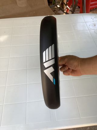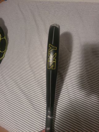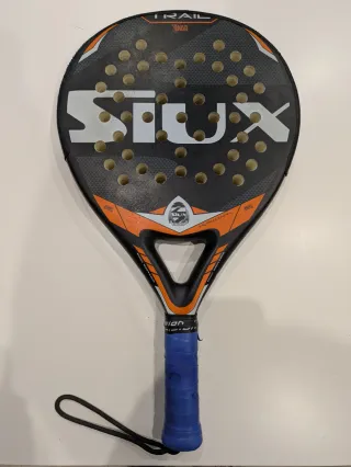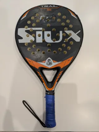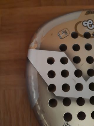 Pala de pádel Siux Trail. Está reparada como se ve en la imagen, y tiene otra pequeña raja entre dos agujeros de la pala. También tiene un desperfecto en la pintura, pero es solo estético.