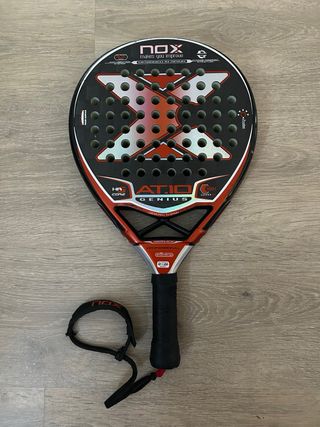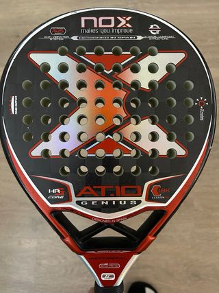 Pala pádel NOX AT10 Genius 18k rojo negro con funda nueva incluida. Tiene un golpe en un lateral (reparable), y el resto mínimas marcas. La cambio porque me han regalado pala nueva.