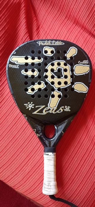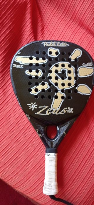 Pala de pádel Zeus 38 mm de la marca Padel Lobbo, en buen estado. - Modelo Zeus. - 38 mm. - Marca: Padel Lobbo. - Diseño elegante en negro y dorado.