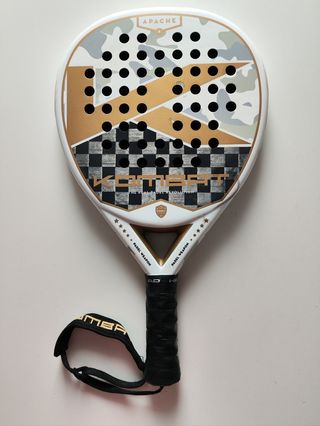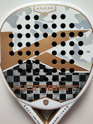 Vendo pala de pádel Kombat Apache 18k, en estupendas condiciones. Tiene unos pequeños desconchones de pintura en ambas caras. Por lo demás, está como nueva y el marco intacto. - Diseño elegante en blanco y dorado. - Superficie con camuflaje y cuadros. - Incluye protector. - Regalo funda Akkeron. - Nivel intermedio-avanzado.