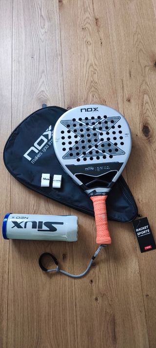 Pala NOX AT10 PRO CUP GENIUS 2024 NUEVA. Incluye FUNDA TÉRMICA NOX. Forma: Lágrima Tacto: Medio-Blando Material plano: Fibra de vidrio Material goma: EVA HR3 PESO: 371 gramos