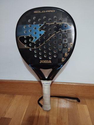 Pala de pádel Joma Gold Pro en color negro con detalles en azul y dorado. Diseño moderno y deportivo. - Pala de pádel Joma. - Modelo Gold Pro. - Color negro con detalles en azul y dorado. - Tiene un roce en el canto