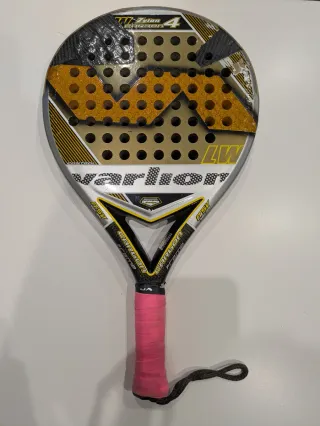 Pala de pádel Varlion Zylon Carbon 4. Está reparada en 4 zonas como se ve en las imágenes (las partes negras de la pala), pero se puede usar sin problema. Al moverla suena, eso se debe al protector de plástico duro que tiene en la parte superior. Ocurre en muchas palas Varlion.