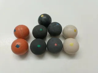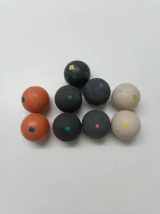 Conjunto de pelotas para pala frontón. Incluye varias pelotas de diferentes colores y marcas. - Pelotas de goma. - Variedad de colores: naranja, negro y blanco. - Marcas distintivas en cada pelota. No han sido usadas el aspecto que presentan de estar guardas.Pesan 70 gramos aprox.