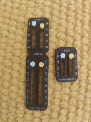 Marcador de pádel para llevar la cuenta de puntos, juegos y sets. - Marcador de puntos con números 0, 15, 30, 40 y AD. - Marcador de juegos. - Marcador de sets. - Incluye dos fichas deslizantes de colores (azul y amarillo) para cada marcador. Marcador pas pala de pádel