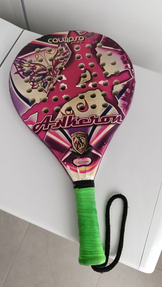 Pala pádel akkeron. Bien utilizada, algo desgastada pero se puede usar perfectamente. Es muy cómoda, blanda. Me ha ido muy bien con ella