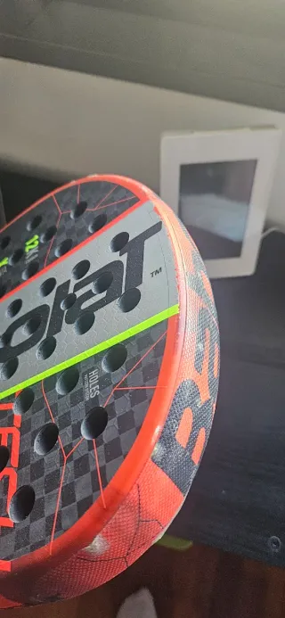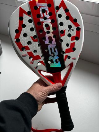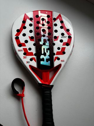 Pala de pádel Babolat Viper con un diseño moderno y llamativo. - Superficie blanca con detalles en rojo y negro. - Logo de Babolat en el centro. - Agarre negro. - Incluye correa de seguridad roja. tengo la caja con otra correa más la pala tiene tres partidos pero no me acostumbro a ella .
