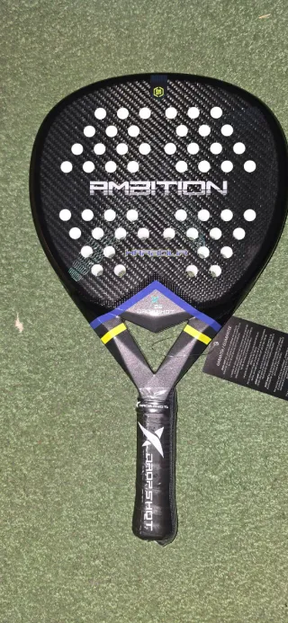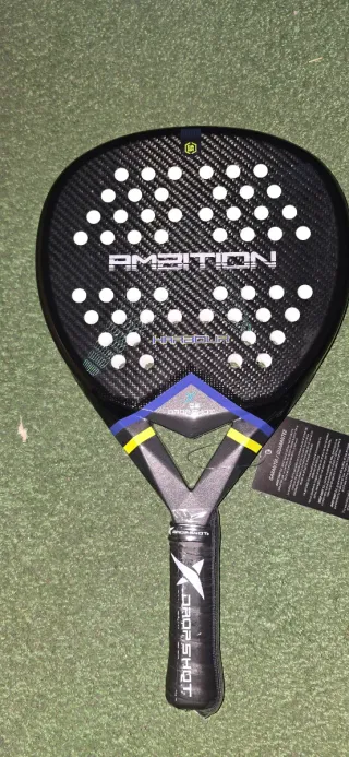 Pala de pádel Drop Shot Harbour con acabado en carbono. - Diseño moderno con detalles en azul y amarillo. - Empuñadura con logo de la marca. - Incluye etiqueta de garantía.
