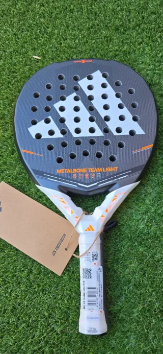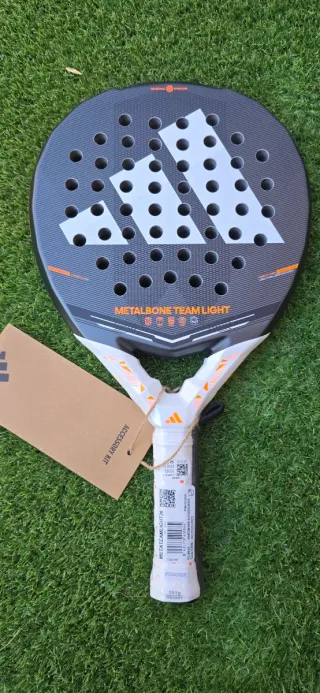 Pala de pádel Adidas Metalbone Team Light. - Diseño en color negro y blanco. - Detalles en naranja. - Logo de Adidas en la cara.