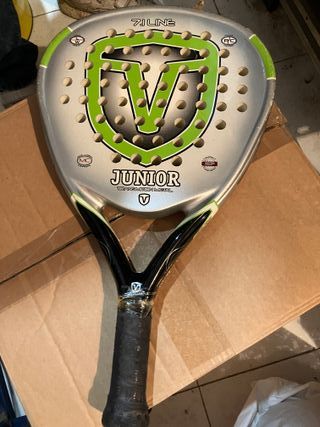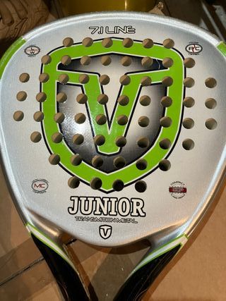 Pala de pádel modelo 7.1 Line, diseñada para jugadores junior. Presenta un acabado plateado con detalles en verde y negro. - Diseño con escudo V en verde. - Inscripción JUNIOR TRANSMITION METAL. - Logos MC (Metal Composite) y CCP (Compact Control Power). - Indicadores LW (Light Weight) y RC (Power Control). Un regalo ideal para Papá Noel o los Reyes Magos y a un precio increíble!!!!!Aprovecha la oportunidad!!!!!