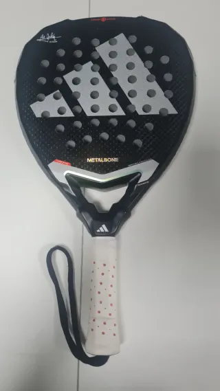 Pala de pádel Adidas Metalbone Team con diseño en negro, blanco y rojo.solo tiene dos partidas,y tiene un pequeño salto de un rasguño en la valla como se ve en la foto.esta completamente nueva - Logo de Adidas en blanco. - Agarre negro. - Correa de seguridad negra.