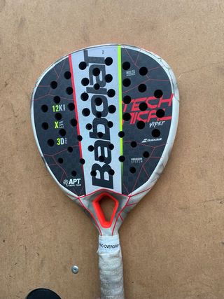 Pala de pádel Babolat modelo Viper Tech. - Diseño con detalles en negro, rojo y verde. - Superficie con patrón de agujeros. - Marca Babolat visible. - Incluye sistema Vibrasorb. - Logo APT Padel Tour.