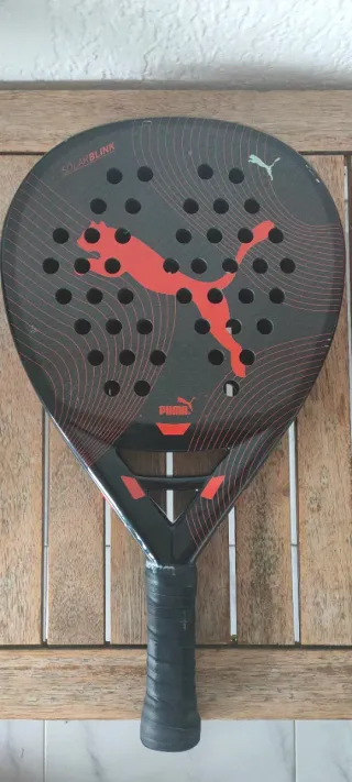 Pala de pádel Puma Solarblink con un diseño moderno y llamativo. - Pala de pádel Puma. - Modelo Solarblink. - Diseño en negro y rojo. - Logo de Puma en la cara. _Con protector