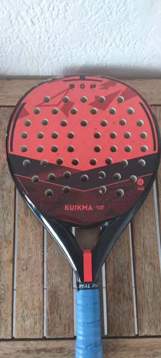 Pala de pádel Kuikma 500 con diseño en negro y rojo. - Superficie con agujeros. - Grip azul. - Incluye correa de seguridad.
