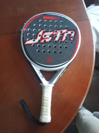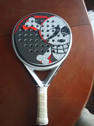 Pala de pádel marca Kostak con diseño deportivo. - Superficie con agujeros. - Logo de la marca en la cara. - Grip blanco para mejor sujeción. - Correa de seguridad negra.