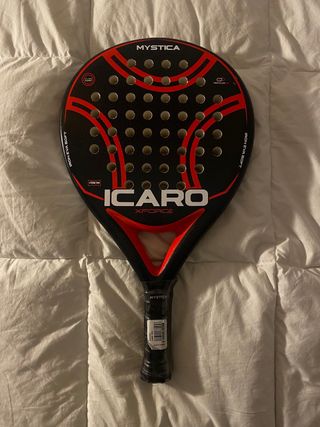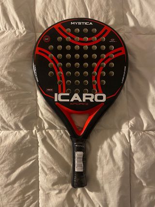 Pala de pádel Mystica Icaro Xforce con acabado en negro y detalles en rojo. - Diseño con el nombre ICARO en grande. - Agarre con cinta negra. - Superficie con múltiples agujeros. - Inscripción IRON EVA SOFT en la parte superior.