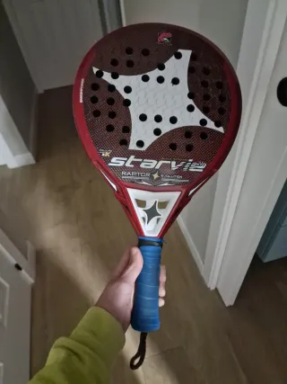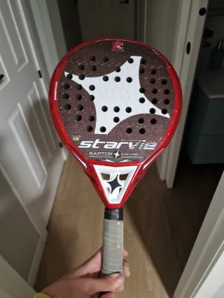 Pala de pádel Starvie Raptor Evolution con un diseño llamativo. - Pala de pádel. - Color rojo y blanco. - Diseño con agujeros.