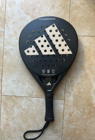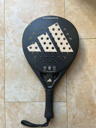 Pala de pádel Adidas RX #GreenPadel. - Diseño en color negro. - Logo de Adidas en color claro. - Incluye correa de seguridad. - Refuerzo estructural.