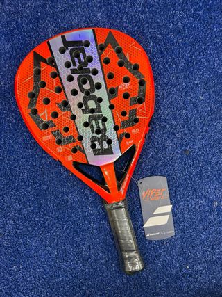 Pala de pádel Babolat Viper J.L. 3.0 con un diseño llamativo en color naranja y negro. - Superficie con agujeros. - Logo de la marca en el centro. - Empuñadura negra.