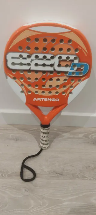Pala de pádel Artengo con diseño llamativo en naranja y blanco. - Superficie con agujeros. - Mango con grip. - Correa de seguridad.
