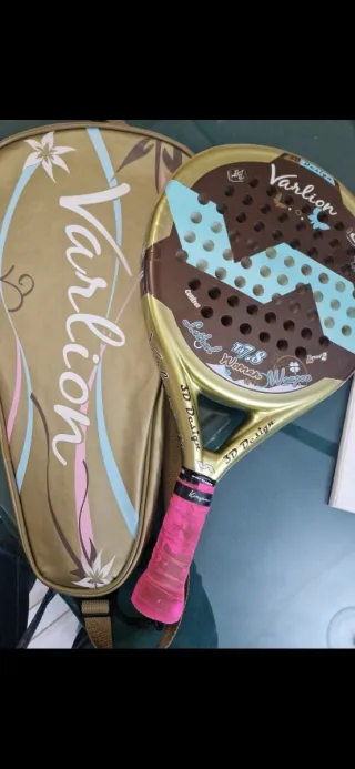 Pala de pádel Varlion con diseño llamativo. - Modelo: 17.8 Woman Weapon - Color: Dorado y marrón con detalles turquesa - Incluye funda protectora - Grip rosa