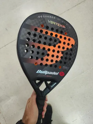Pala de pádel Bullpadel Vertex 02. Vendo por cambio a otra pala. Artículo en buen estado. Excelente salida de bola, pala de potencia. Roces en el protector que no afectan al juego. - Diseño con acabado en carbono y detalles naranjas. - Agarre blanco. - Incluye correa de seguridad negra.