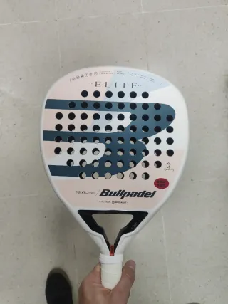 Pala de pádel Bullpadel Elite Woman. - Pala de test. - No se aceptan cambios. - Diseño en blanco con detalles en rosa y azul. - Superficie con agujeros. - Logo de Bullpadel en el centro. - Firma G.G. y sello Solo Test.